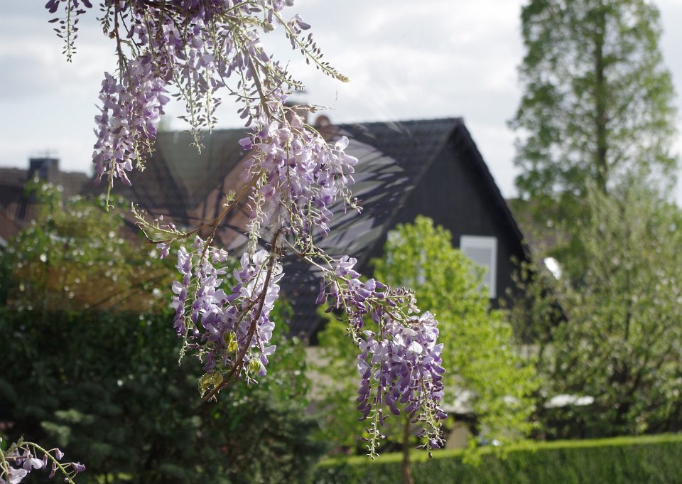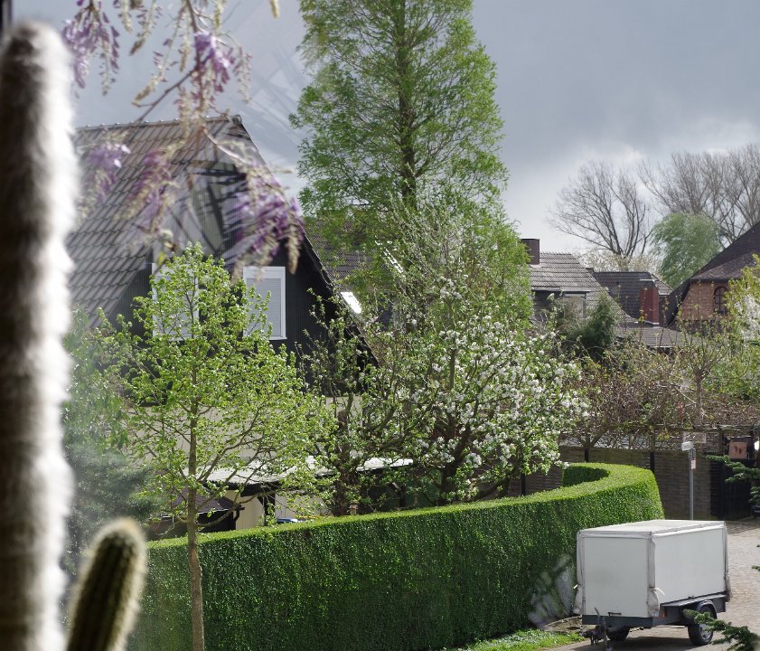 3... ein schöner Kontrast zu den anderen Bäumen ... Sein aufkommendes Grün stand dann in herrlichem Kontrast zu den anderen Bäumen und Sträuchern sowie zu dem blühenden Blauregen an meinem Fenster.