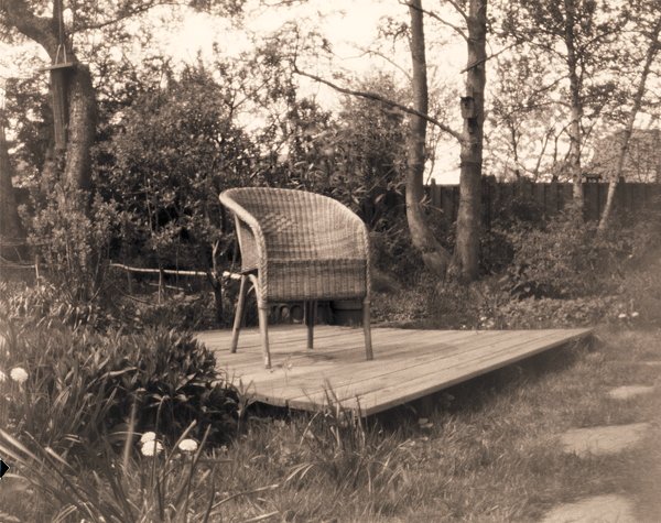5 Weidensessel im Garten Dosen-Lochkamera Luminos Obscura 4x5 inch, f 288, Classic Pan 200/160 - 27.April 2008 - |