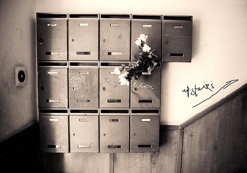 16 Congratulation im Treppenhaus Chinon CP7-m, 2.8/35-70, Ilford HP5 - Sommer 1989 -