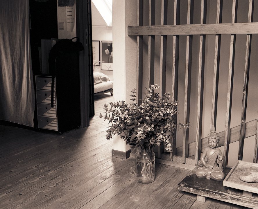82 Meditation vor der Wand Pentax 645N, SMC FA 2.8/45, Pentax Blitz AF-500 FTZ, Ilford Delta 100@64