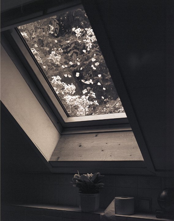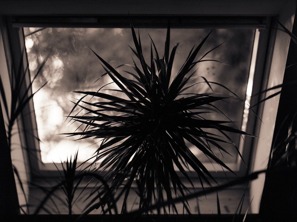 64 Drachenbaum vorm Dachfenster Pentax 645N, 2.8/150, Ilford HP5plus@800