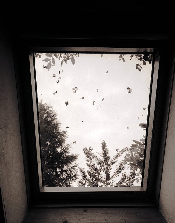 77 Ramblerblüten am Dachfenster Canham DLC 45; Apo Sironar-N 5.6/150, Bergger Pancro 400@320