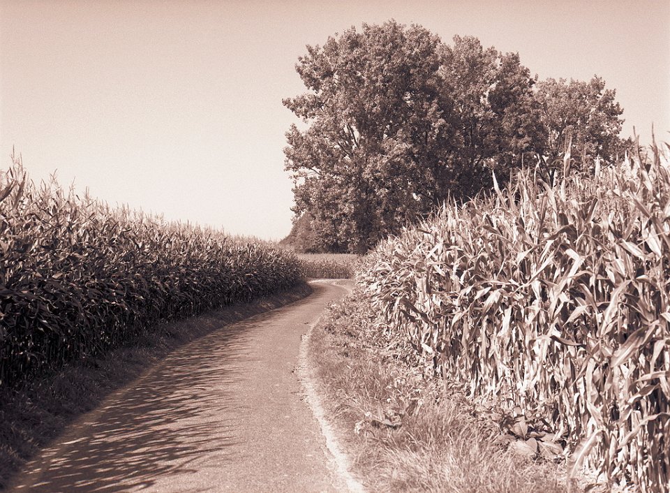 124 Weg zwischen Maisfeldern Pentax 645N, 2.8/75, Gelbfilter, FP4+@80 - 17.09.2014 - |