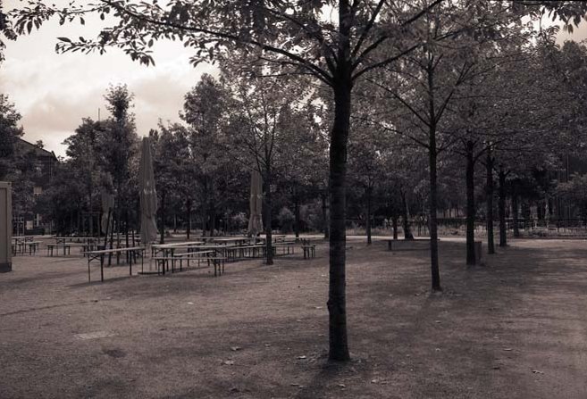 40 Leere Bänke Pentax MZ-S, SMC FA 1.9/43 Limited, Gelbfilter, Ilford HP5plus@800 |