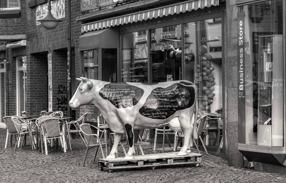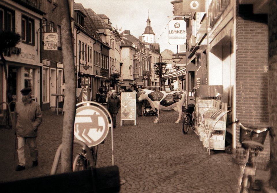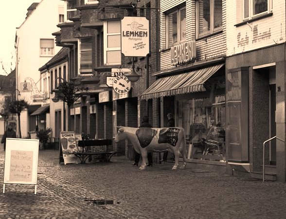 32 Die Kuh in der Einkaufsstraße Pentax LX, Adapter+Zeiss Planar 1.4/50; Ilford HP5plus@25 |