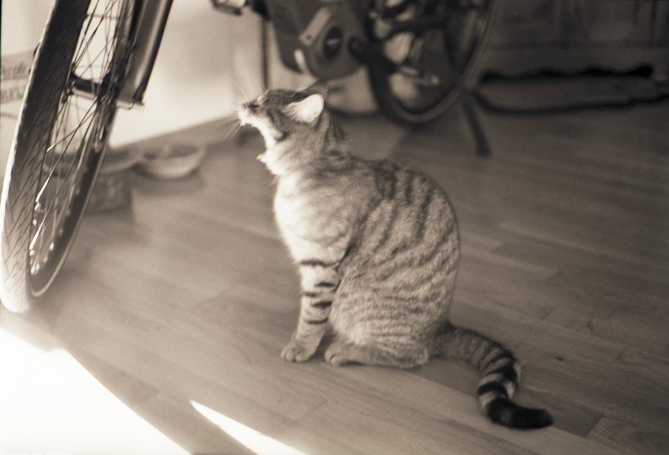 2 Kater Mito und Fahrrad im Zimmer Pentax MZ-S, SMC FA 1.9/43 Limited, Adox Silvermax 100@64