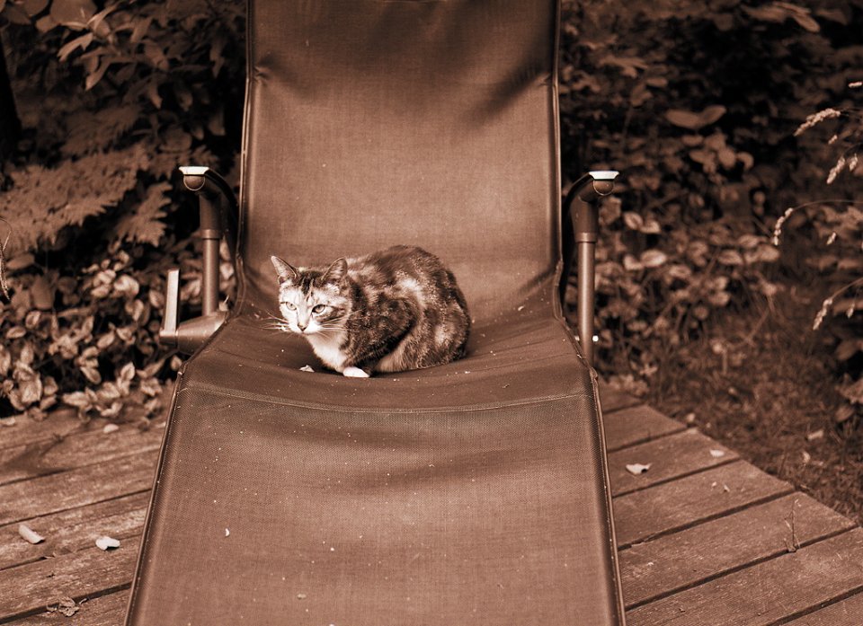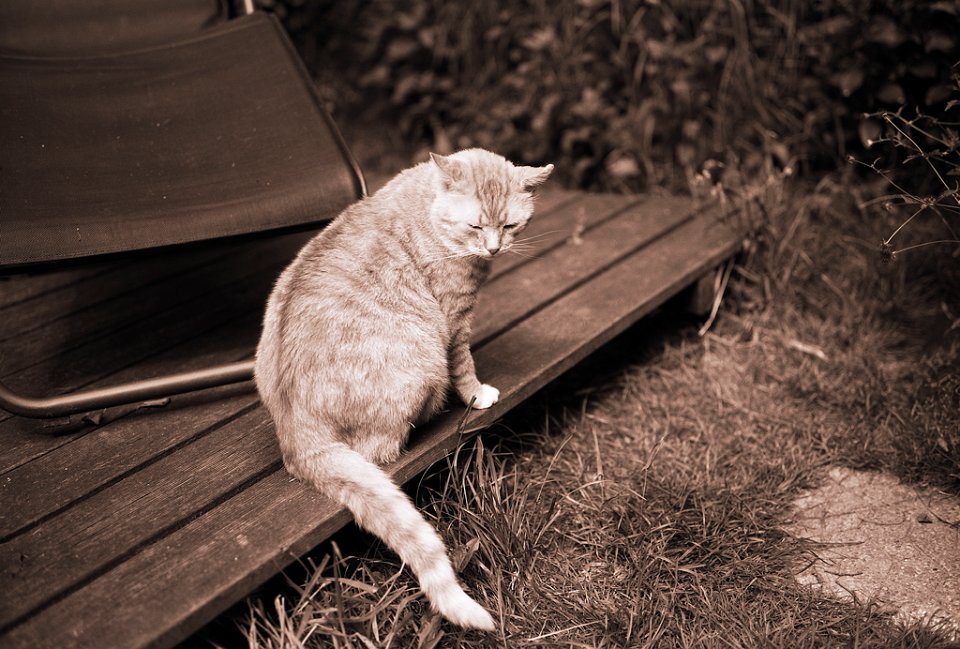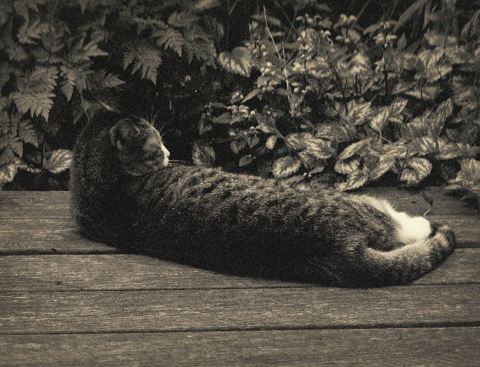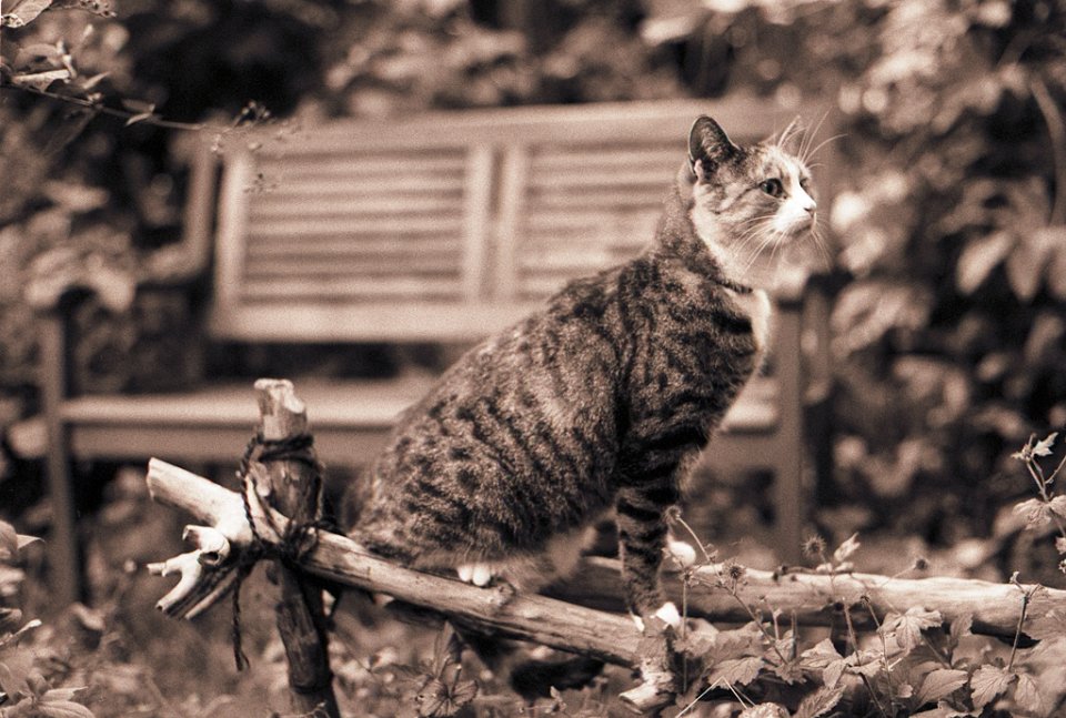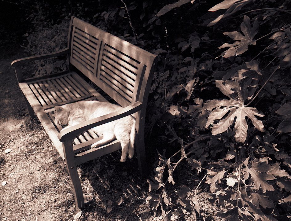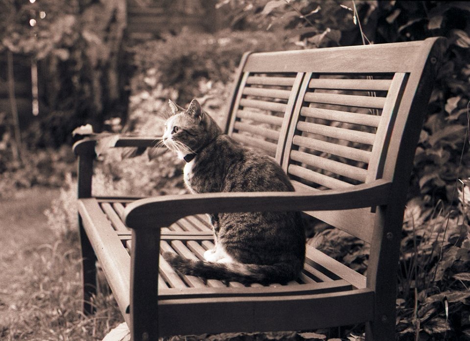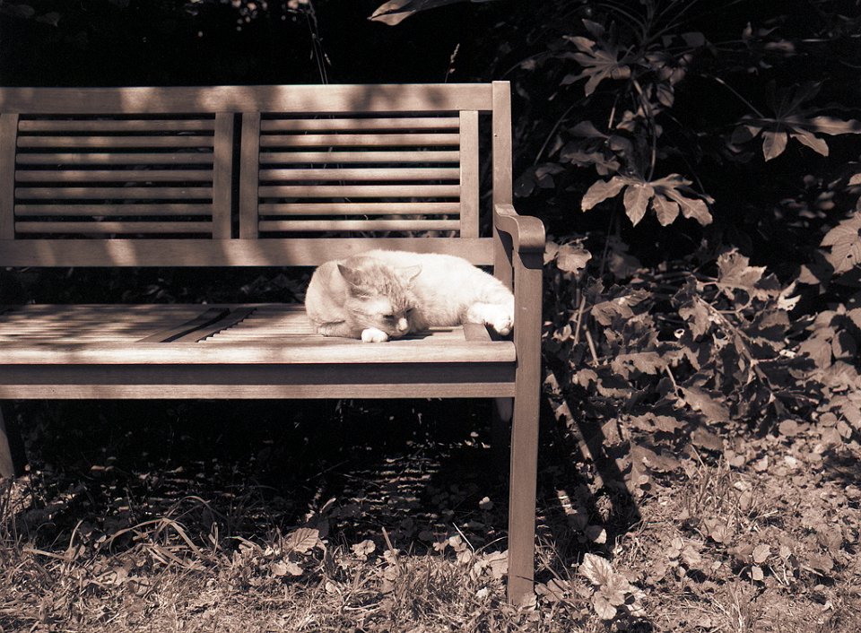 79 Grey auf der Gartenbank Pentax LX, SMC 1.4/50; Ilford HP5+@800 - 08.09.2015 - |