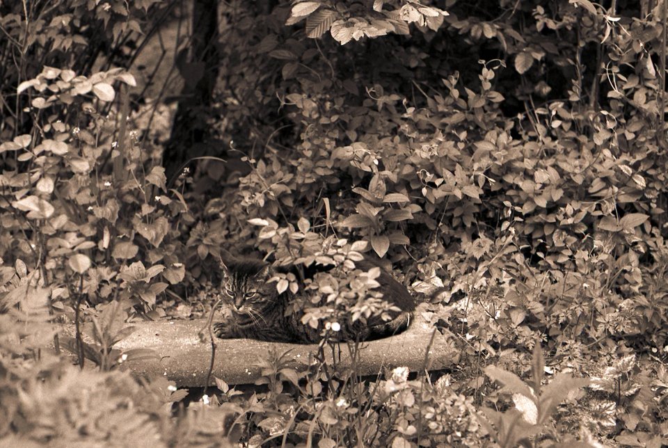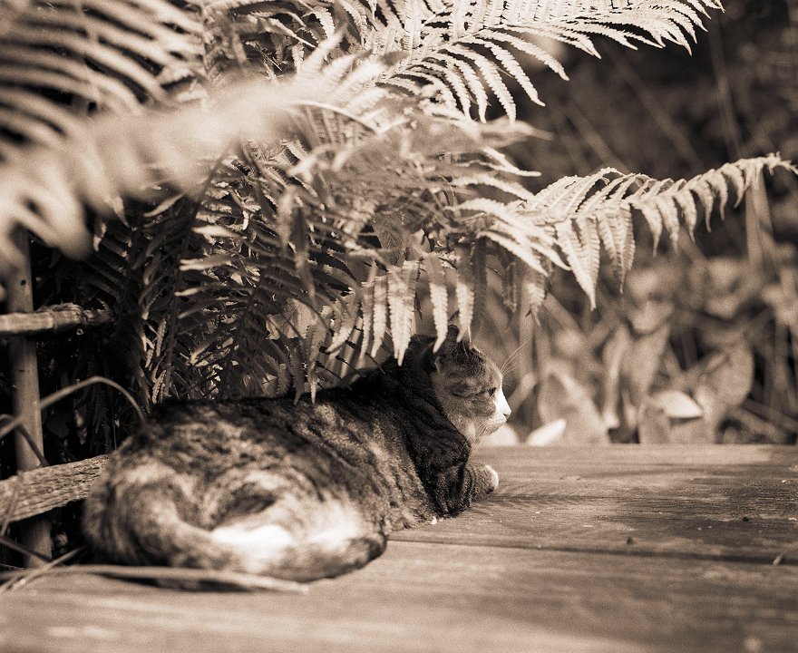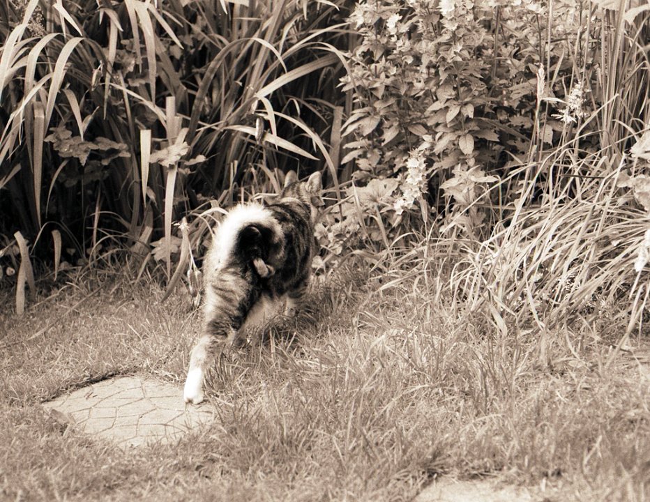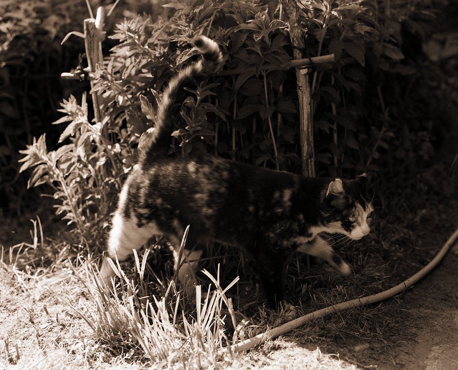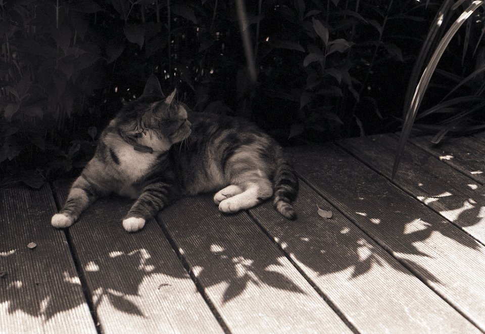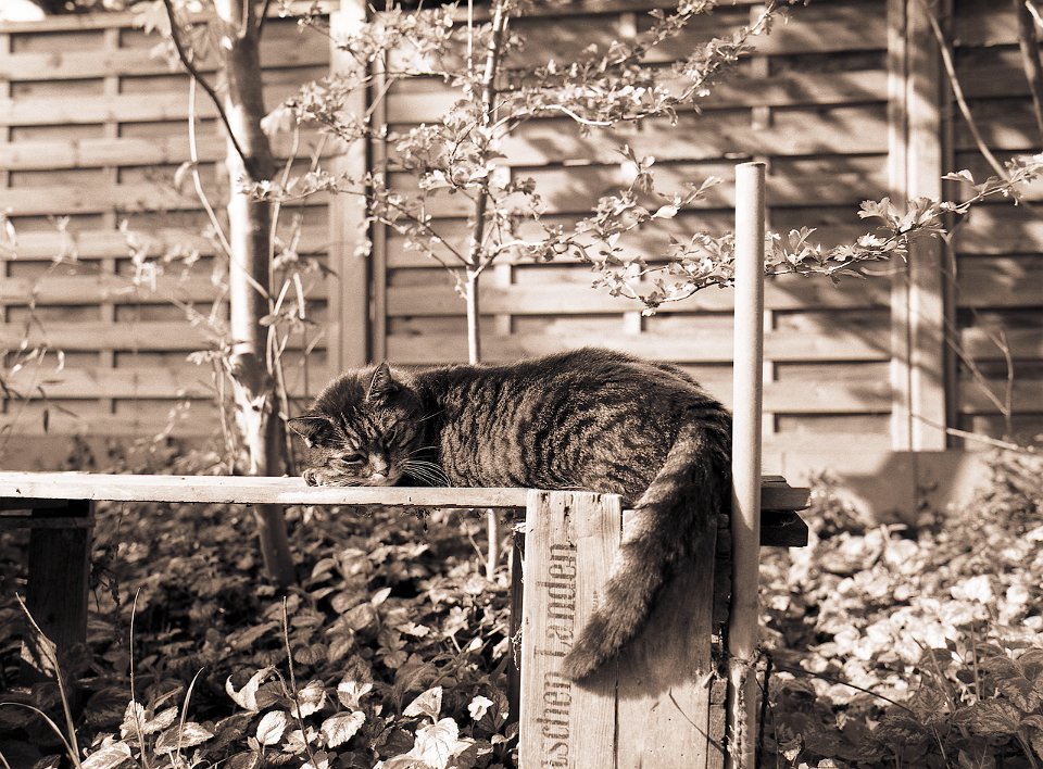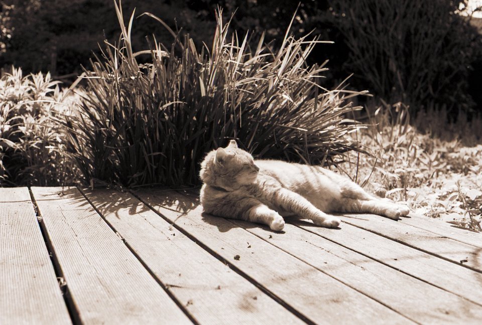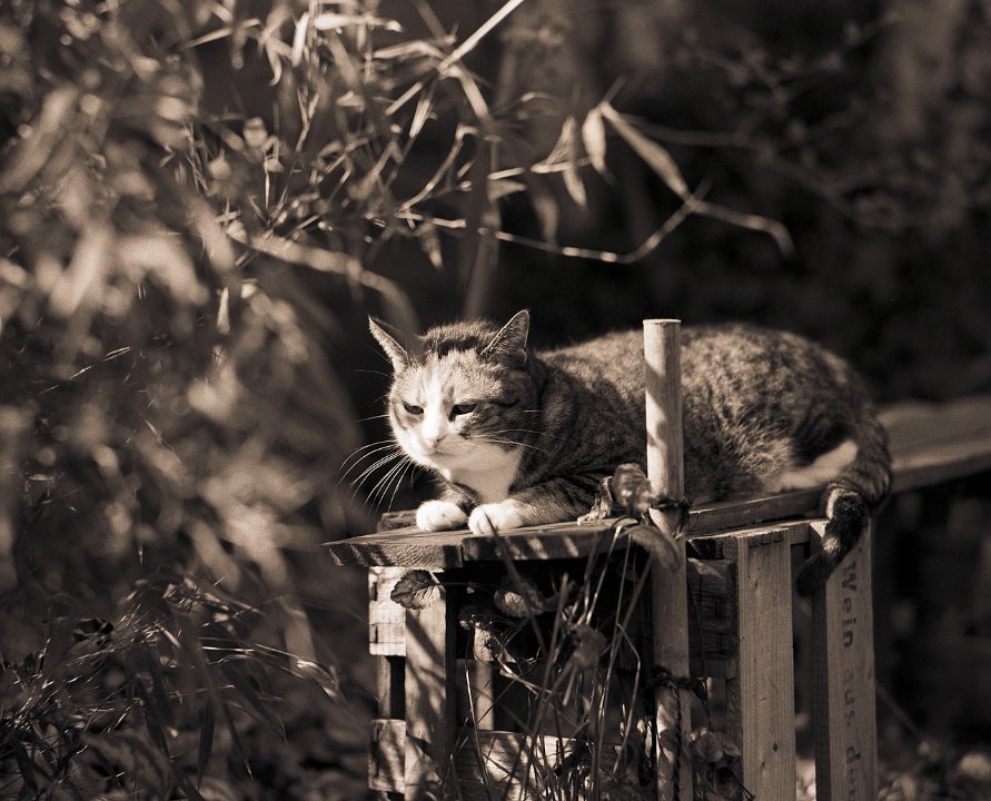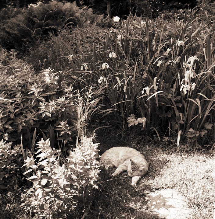 38 Rota schläft auf dem Gartenweg Seagull 4A103-HAIOU 3.5/75, Rollei RPX100@100 |