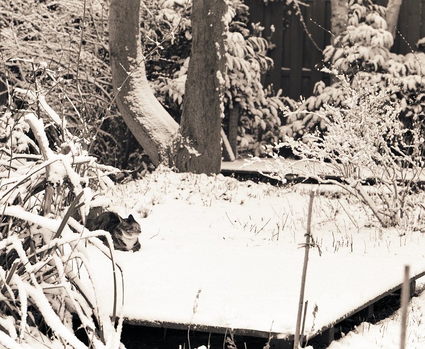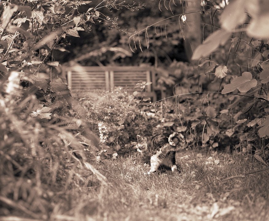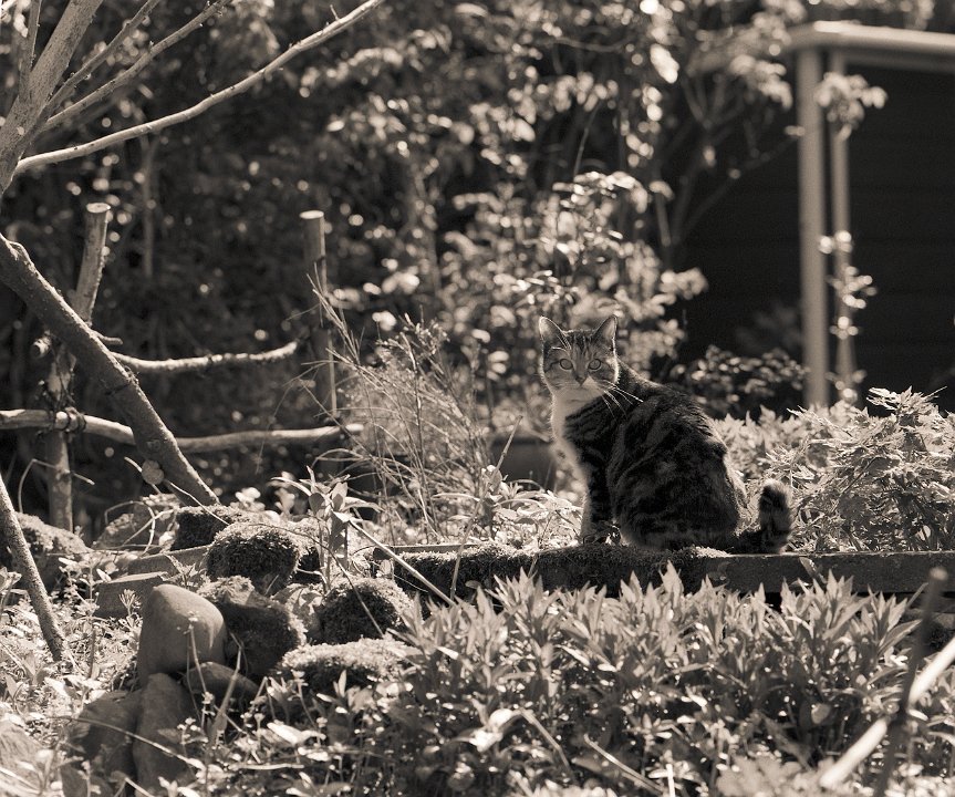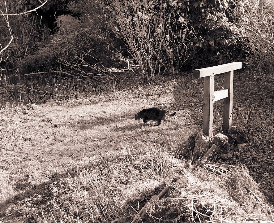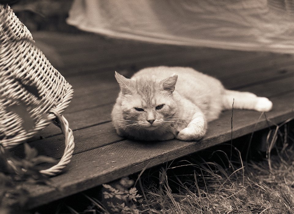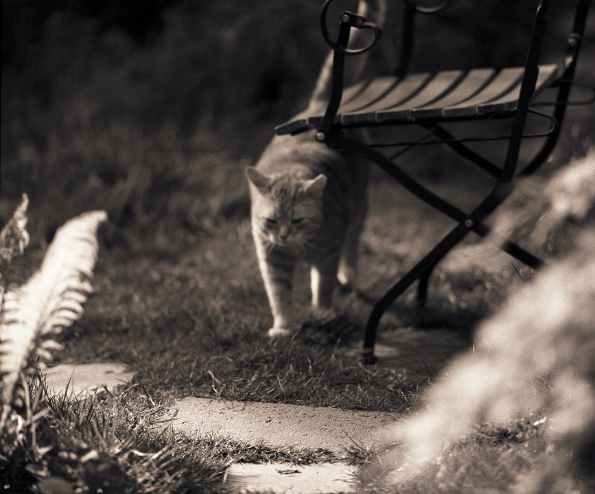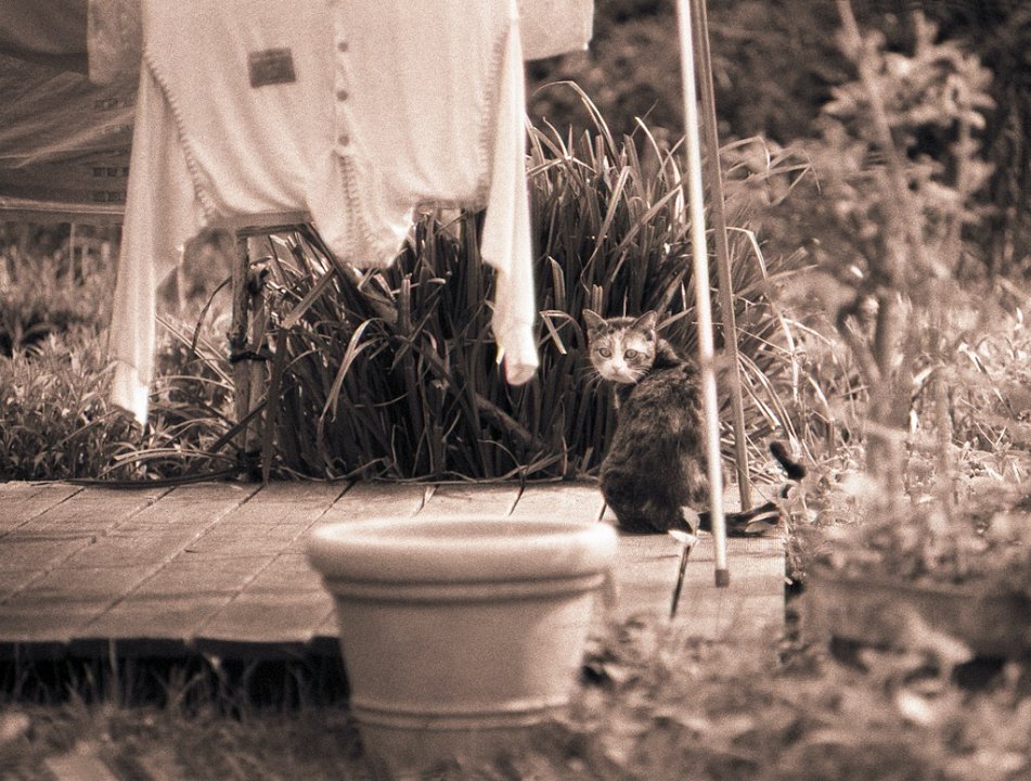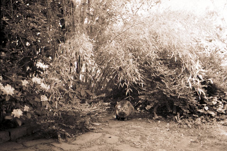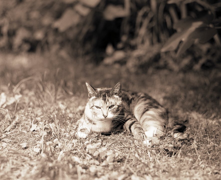 38 Rota schläft auf dem Gartenweg Seagull 4A103-HAIOU 3.5/75, Rollei RPX100@100 |