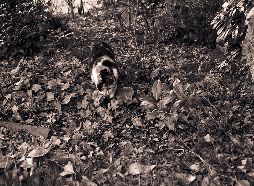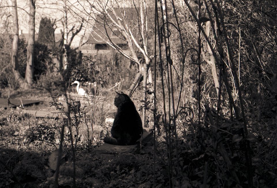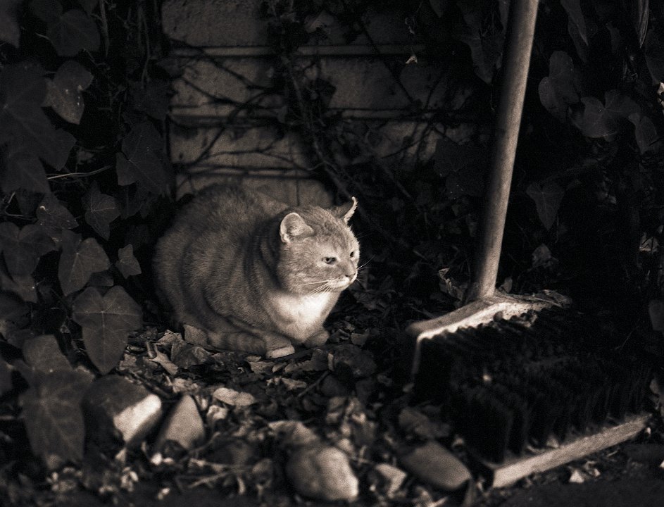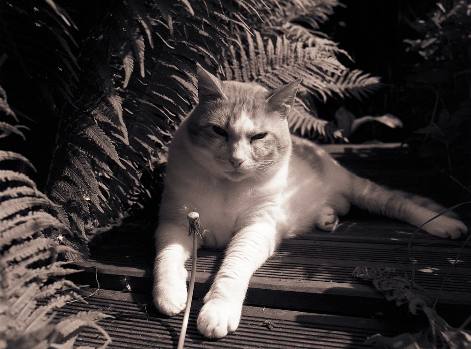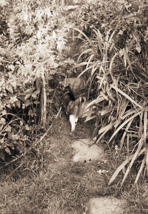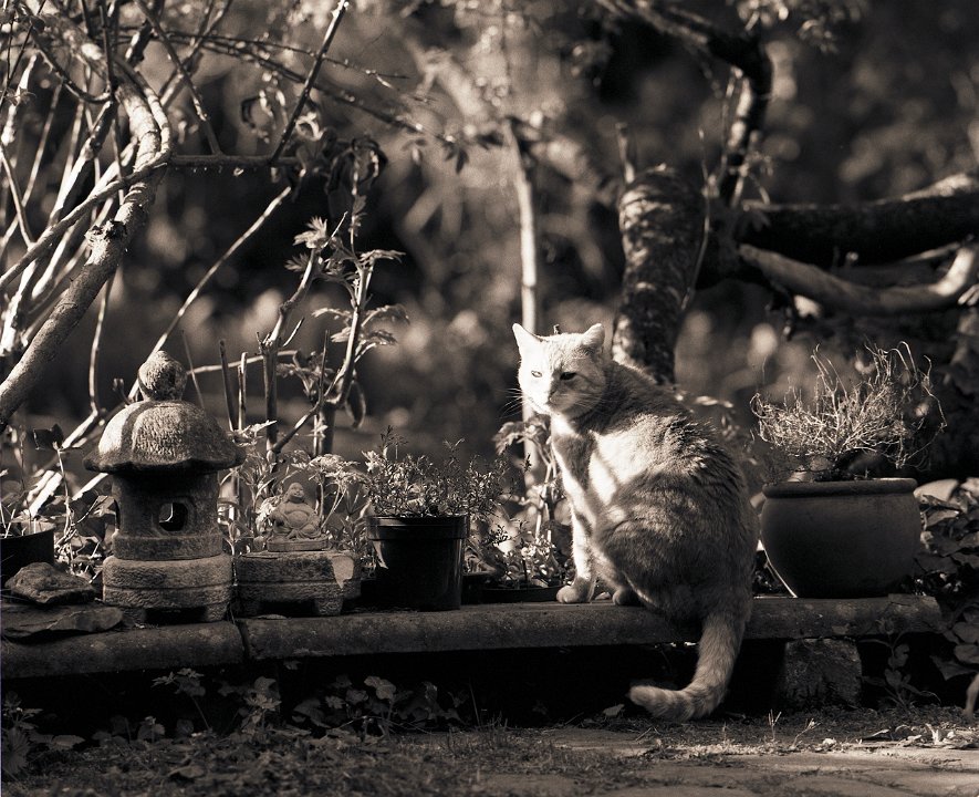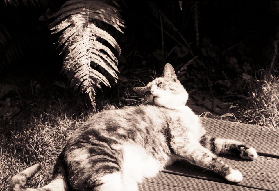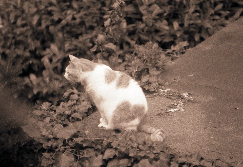 38 Rota schläft auf dem Gartenweg Seagull 4A103-HAIOU 3.5/75, Rollei RPX100@100 |