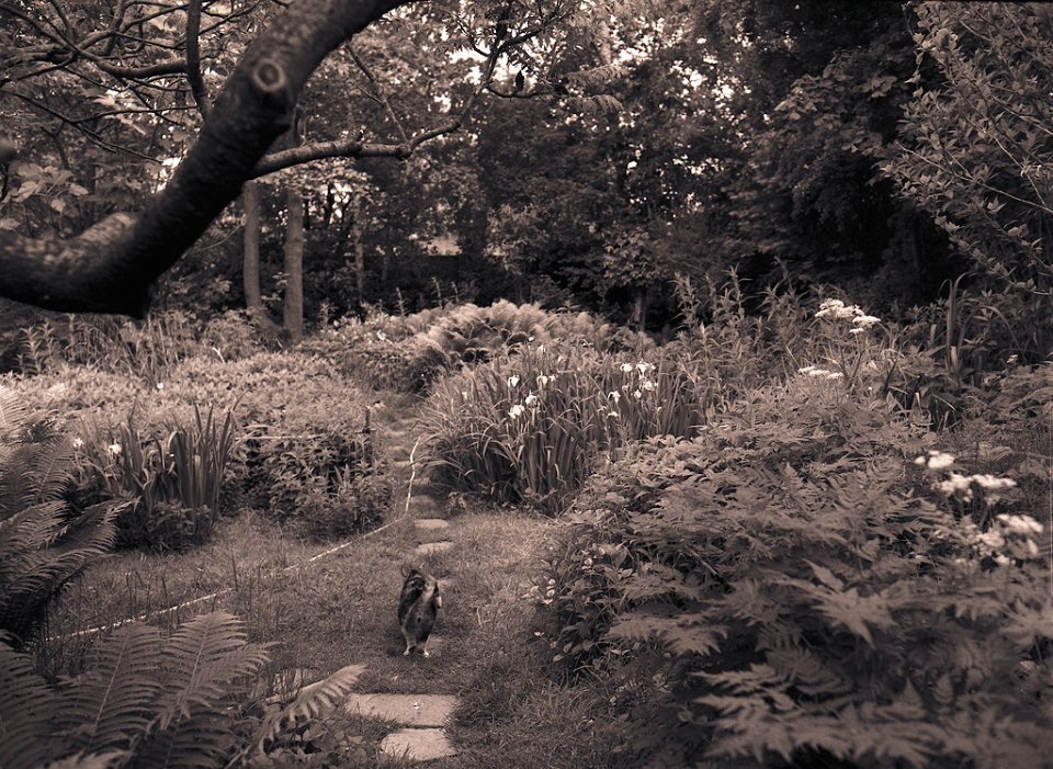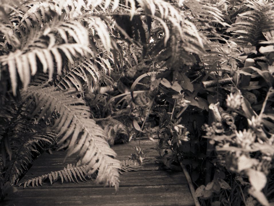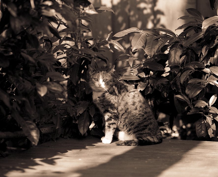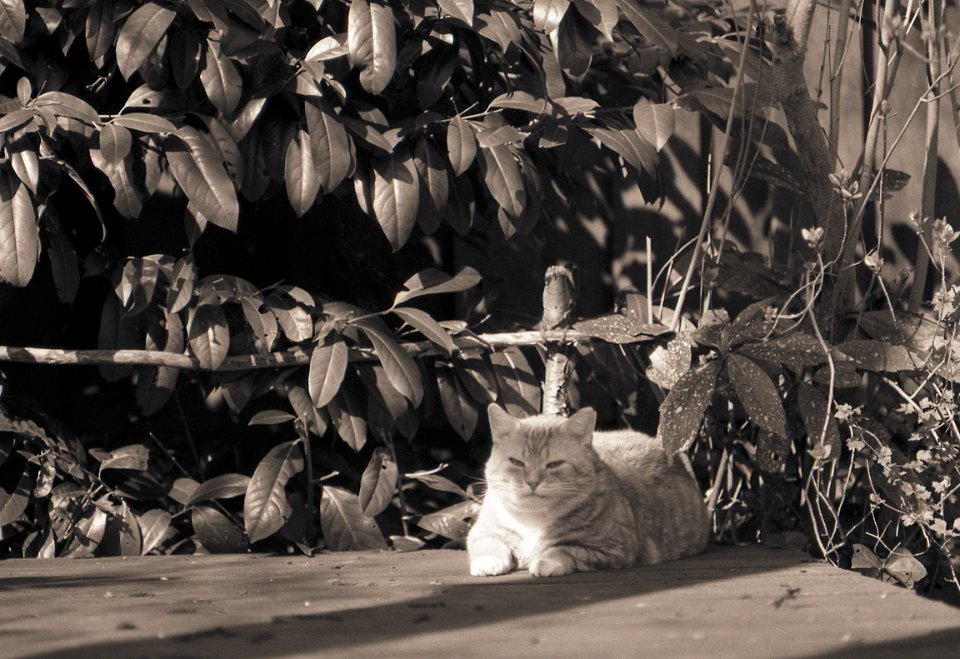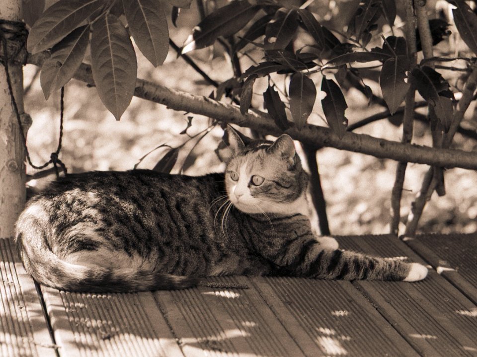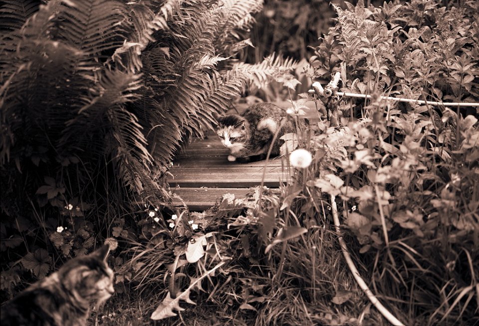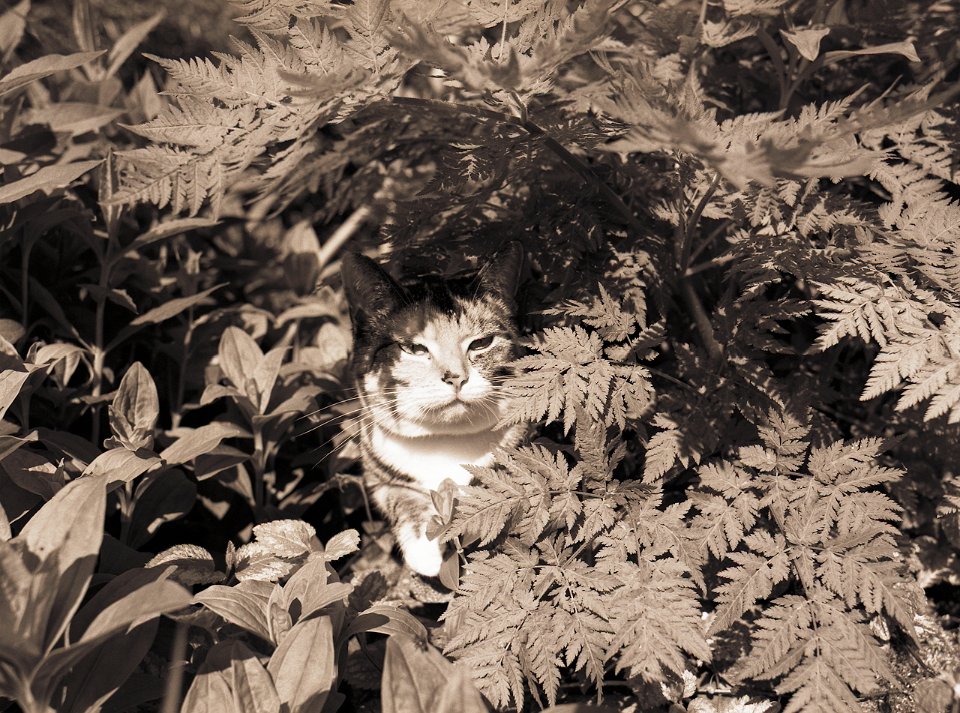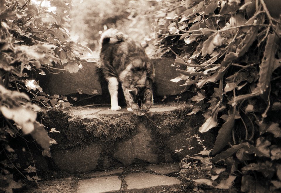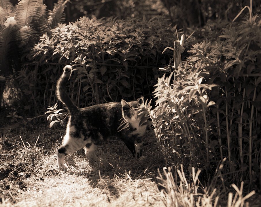 38 Rota schläft auf dem Gartenweg Seagull 4A103-HAIOU 3.5/75, Rollei RPX100@100 |