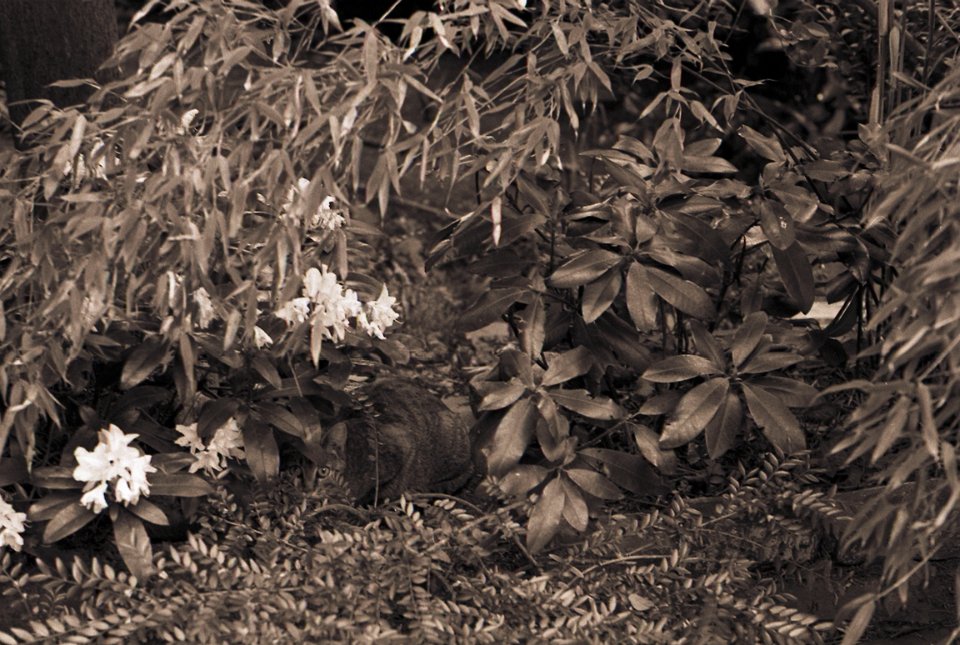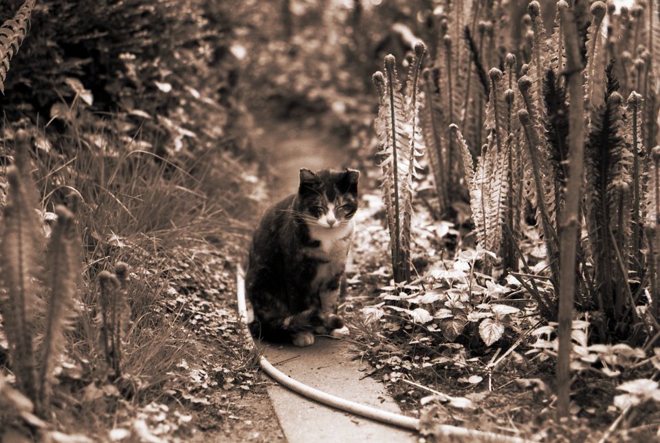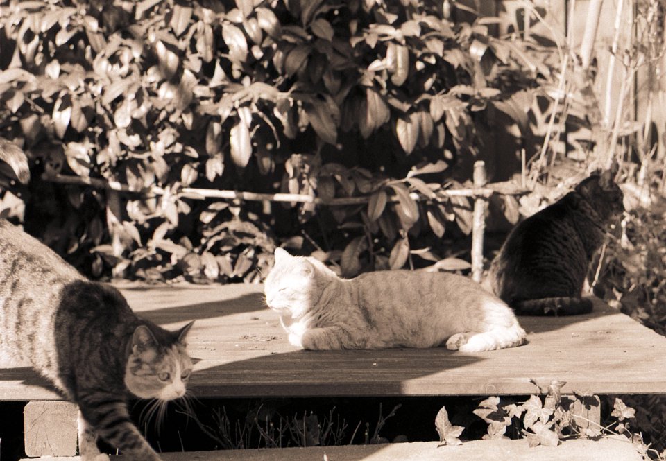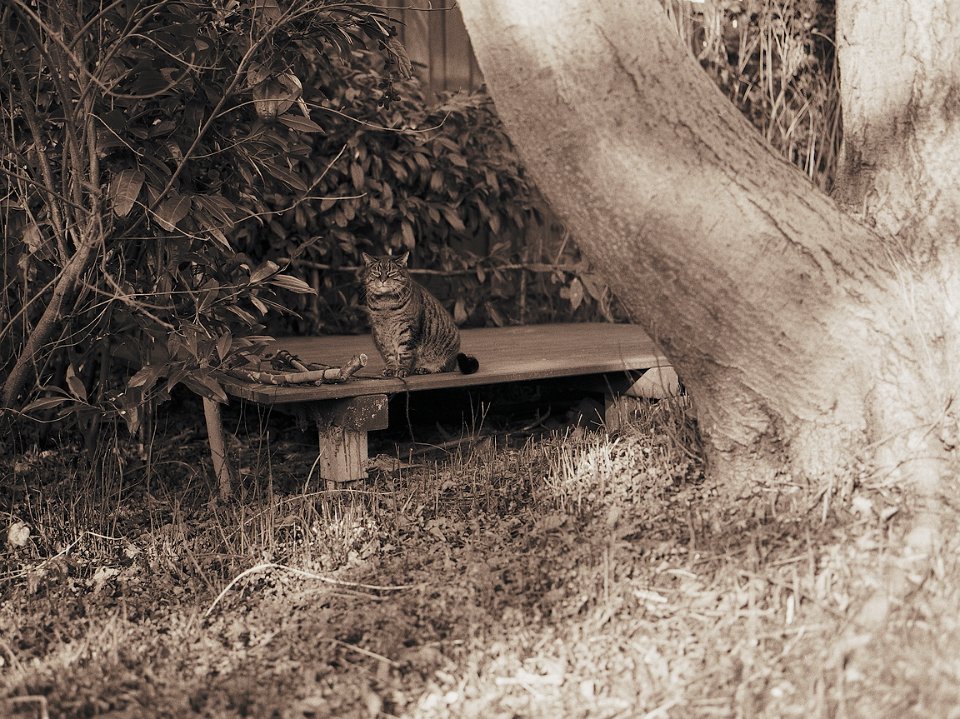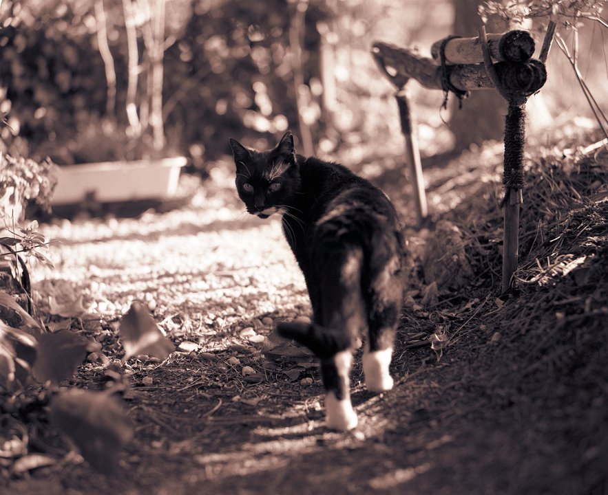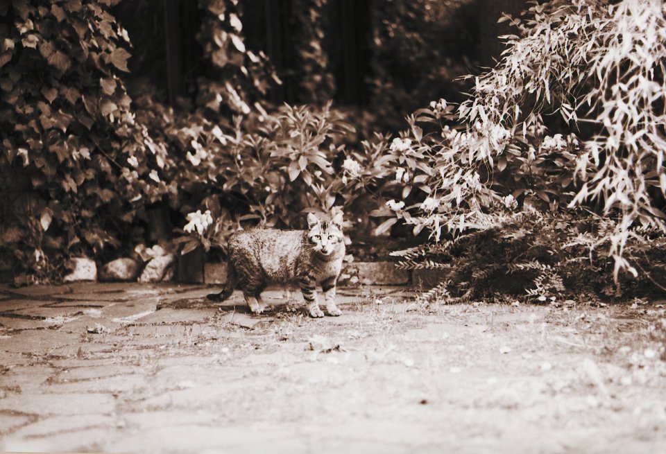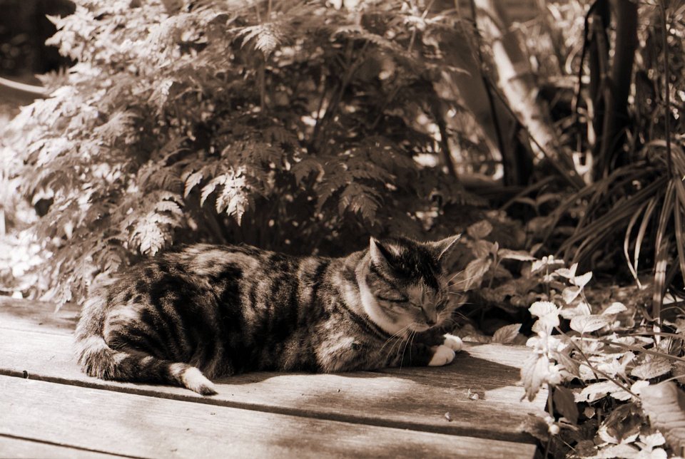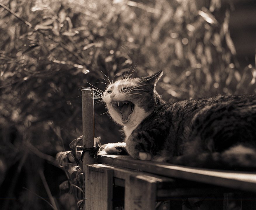 38 Rota schläft auf dem Gartenweg Seagull 4A103-HAIOU 3.5/75, Rollei RPX100@100 |