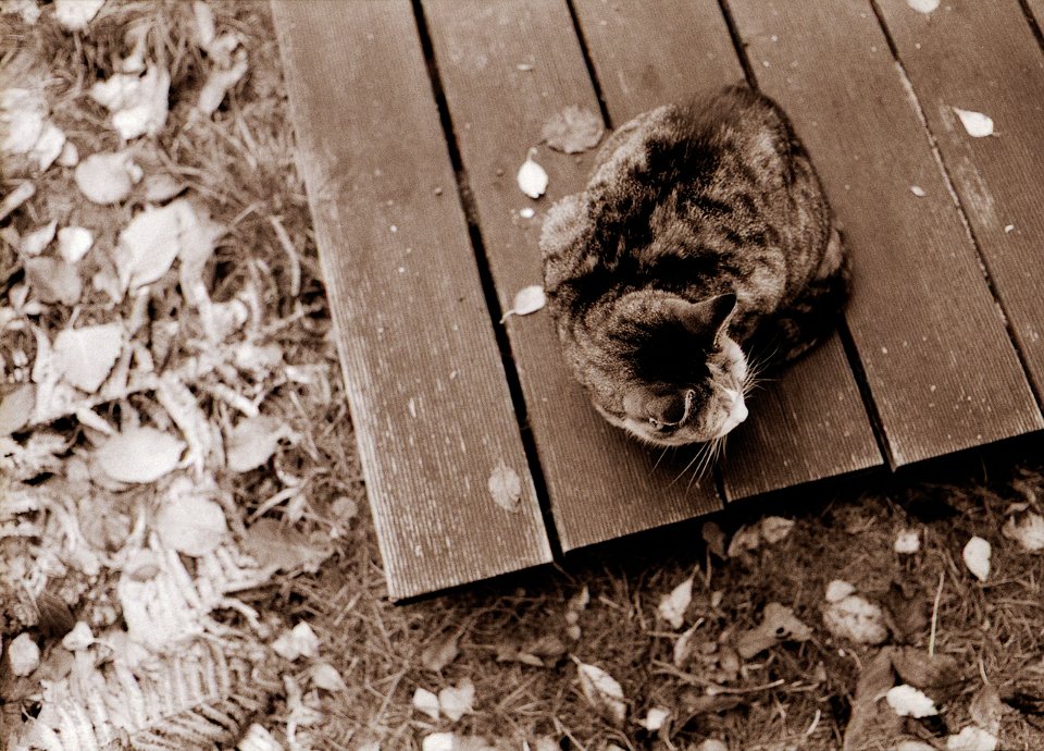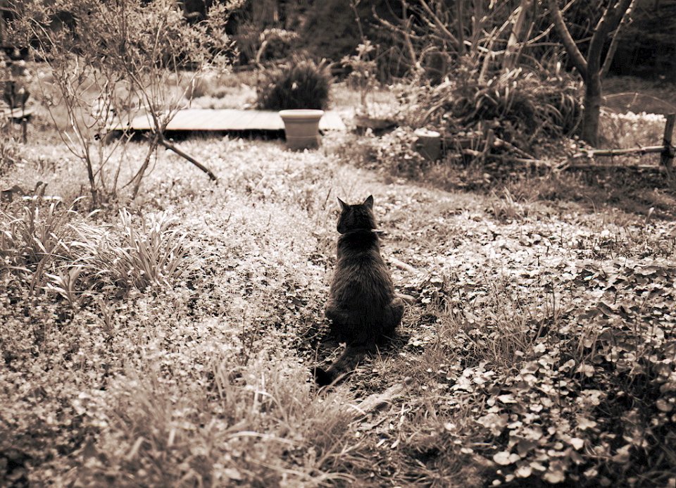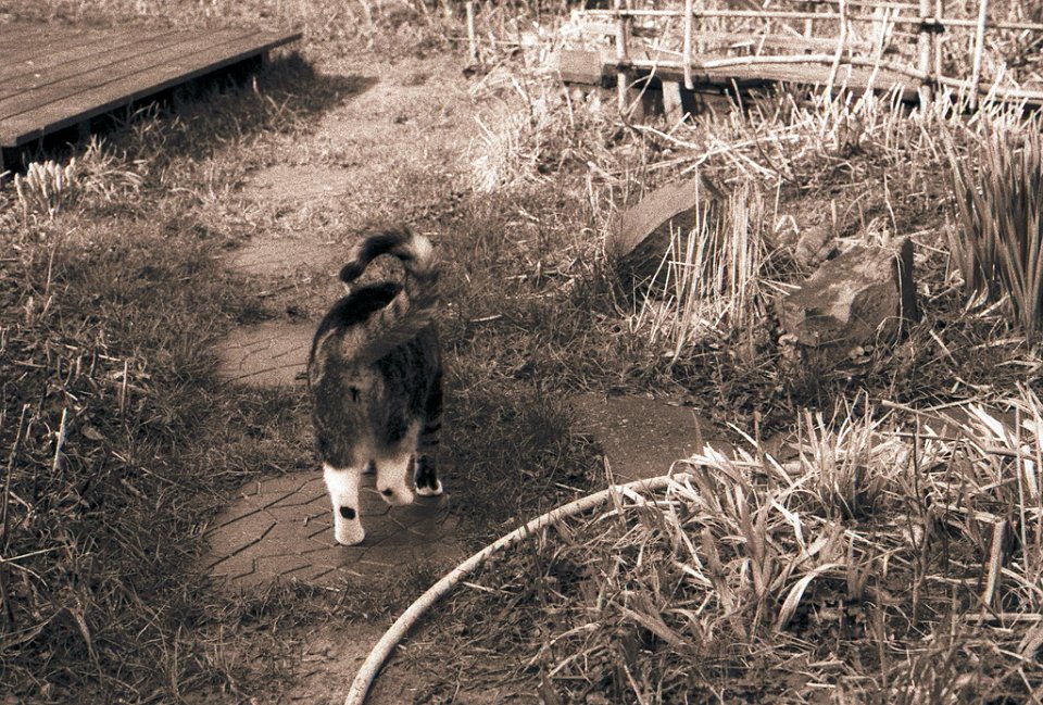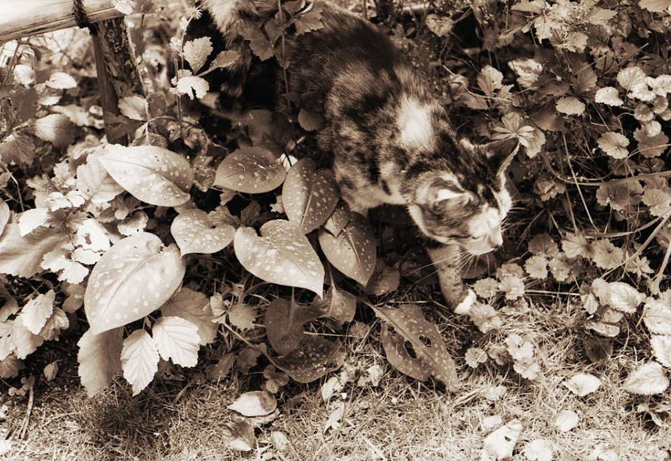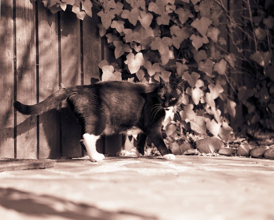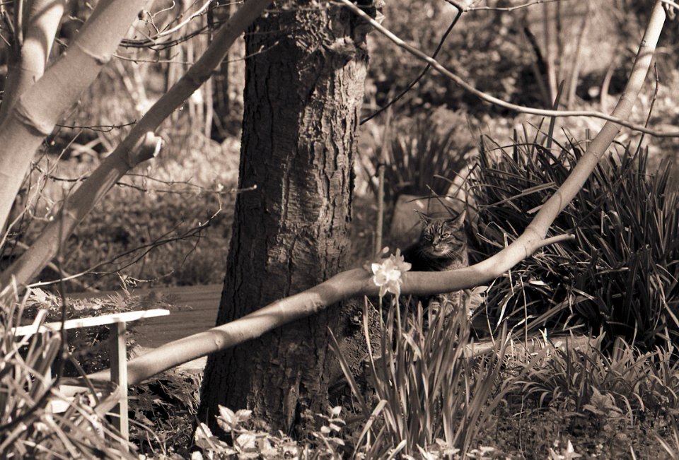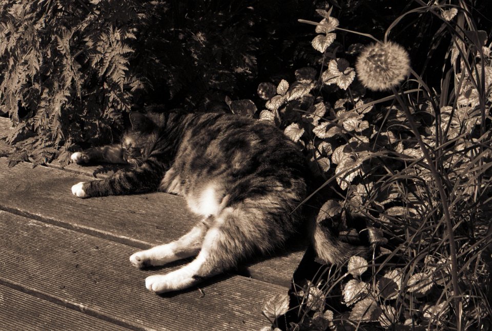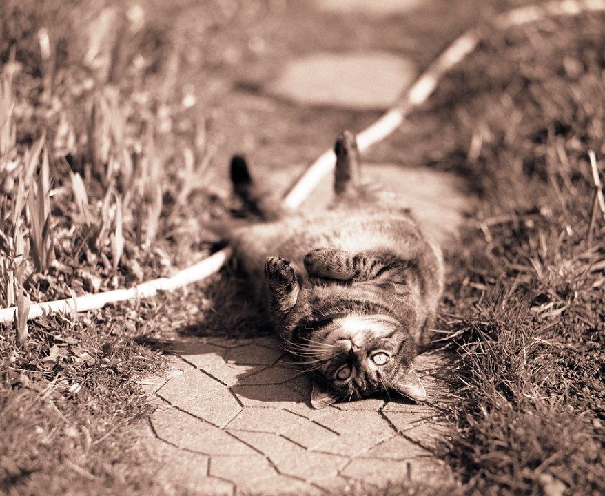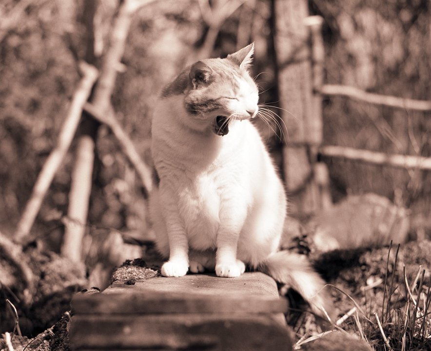 38 Rota schläft auf dem Gartenweg Seagull 4A103-HAIOU 3.5/75, Rollei RPX100@100 |