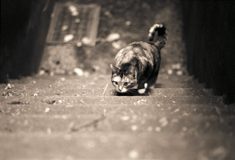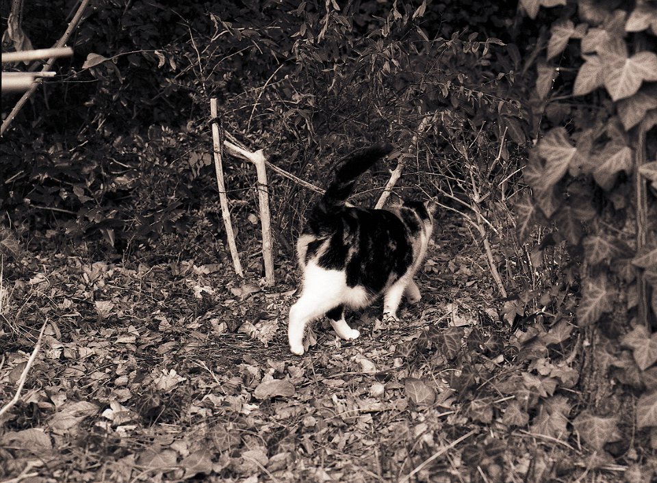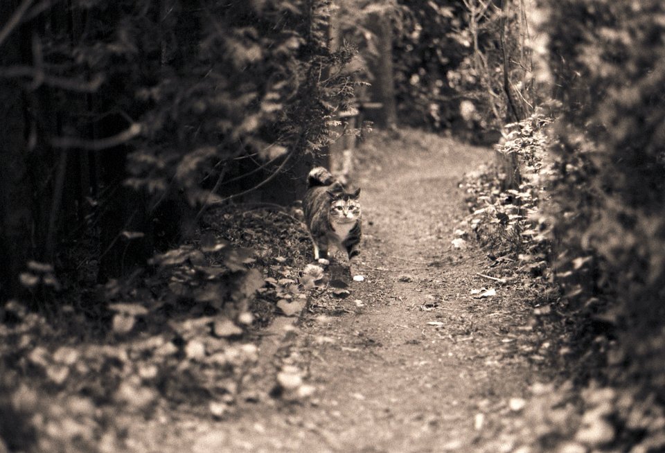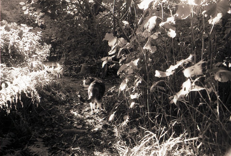 58 Herbstgartenweg und Grey die Katze Pentax LX, SMC 2.8/24; Ilford HP5plus@800 |