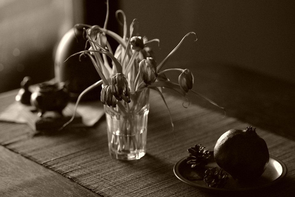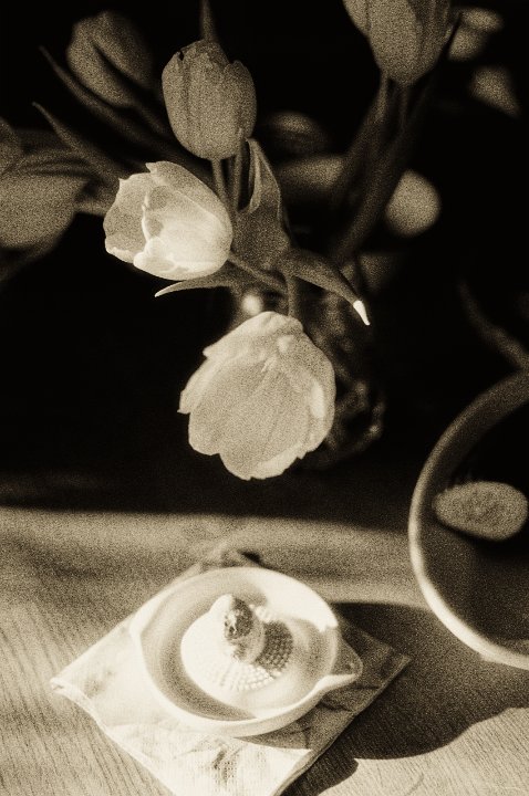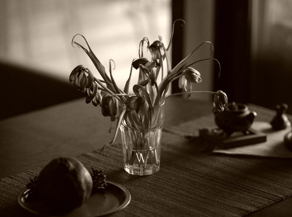 76 Stillleben mit Tulpen und Maneki Neko Pentax 67II, SMC 2.4/105, Gelbfilter, Fuji Acros 100II @64 |