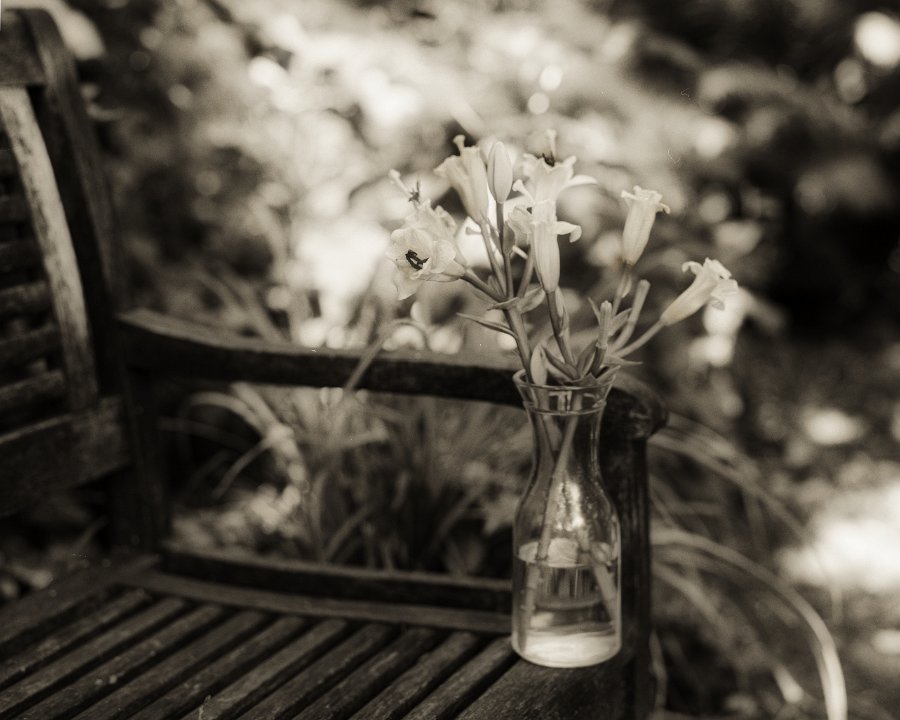 123 Lilien abgestellt auf der Gartenbank Pentax 67 II, SMC 2.4/105, Fuji Acros 100 II, Rotfilter - 11.08.2023 - |