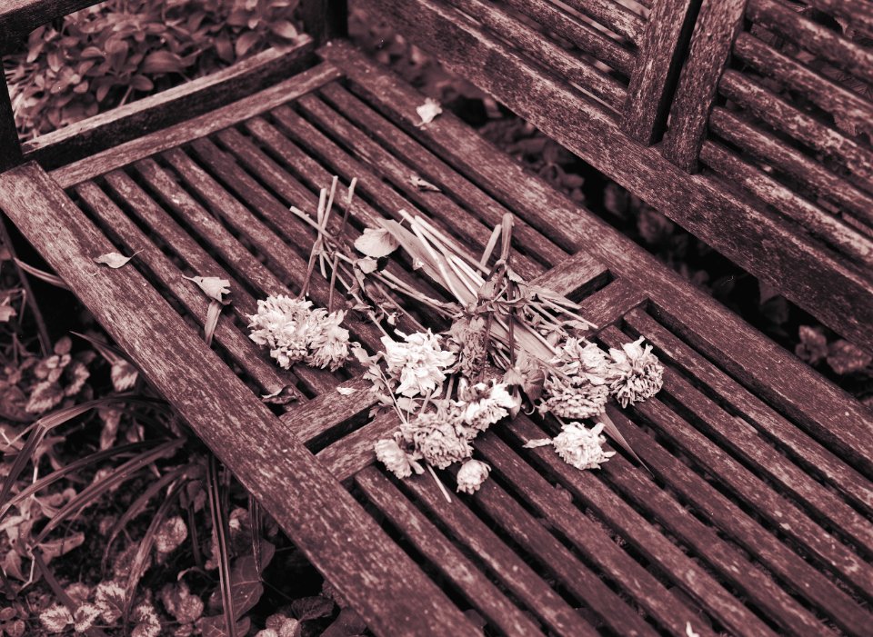 125 Verblühte Dahlien auf der Gartenbank Pentax 645N, SMC 2.8/75, Gelbfilter, Fuji Acros 100II - 09.09.2023 - |