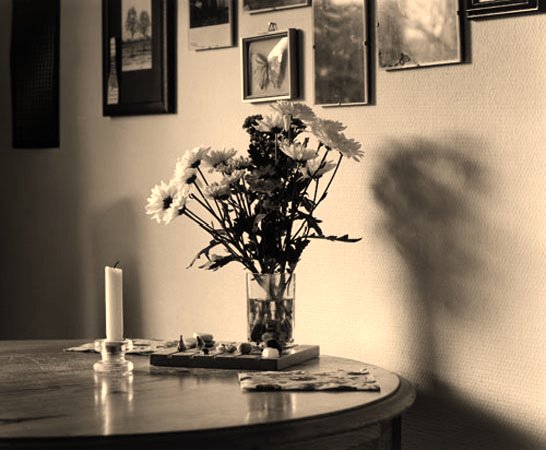 16 Chrysanthemen auf dem Tisch Canham DLC45; Apo Ronar 9/300; Rollei IR 400/200ASA; Agfa MCC - 9.11.2007 - |