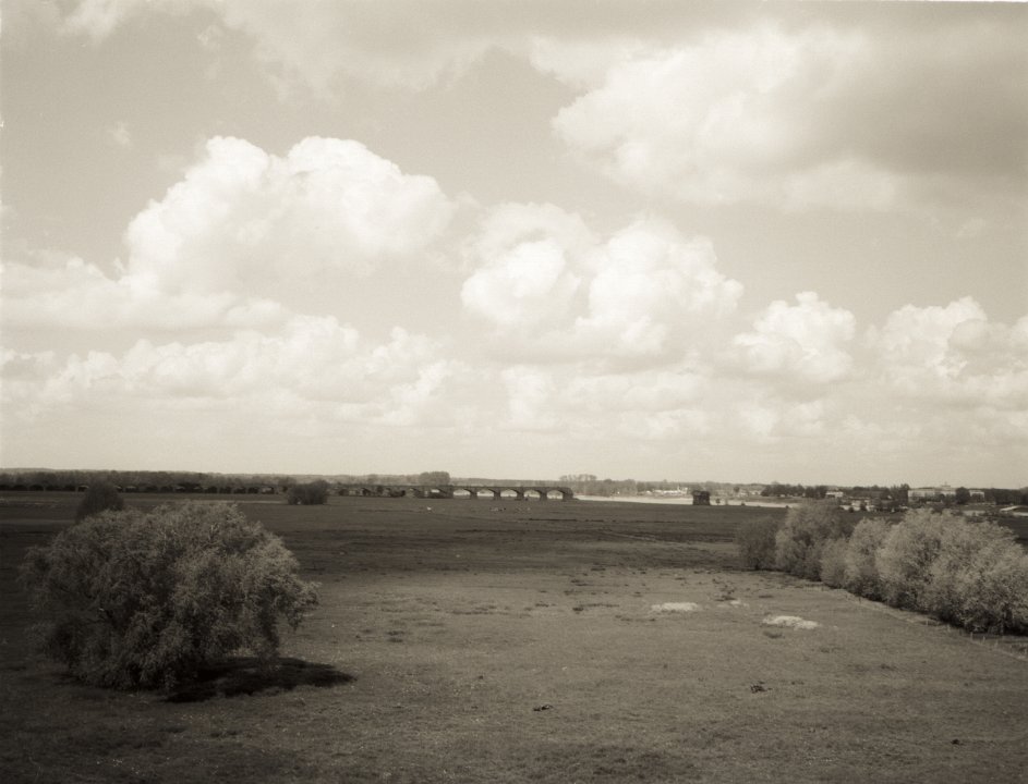 2 Rheinwiesen und Eisenbahnviadukt Ruine Fuji GS645S professional WIDE60, Fuji 100 Acros II |