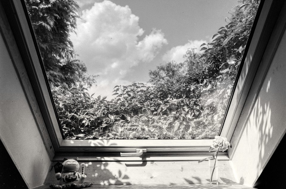 64 Drachenbaum vorm Dachfenster Pentax 645N, 2.8/150, Ilford HP5plus@800