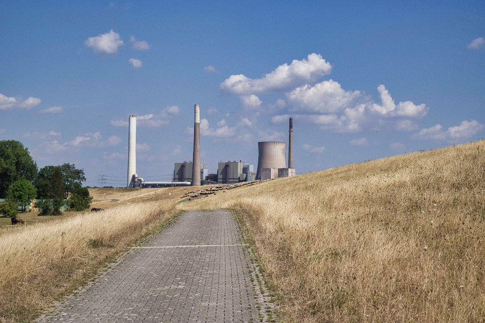 Rheindeich mit Blick aufs stillgelegte Kraftwerk Voerde